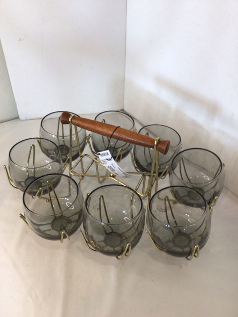 Vintage Set of 8 Smoke Glass/Metal In Holder Glasses