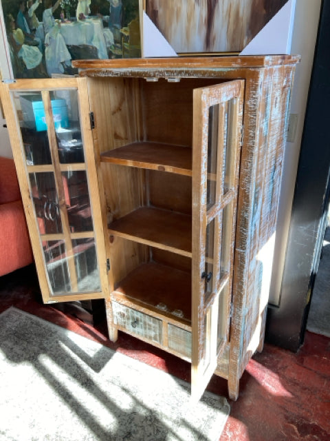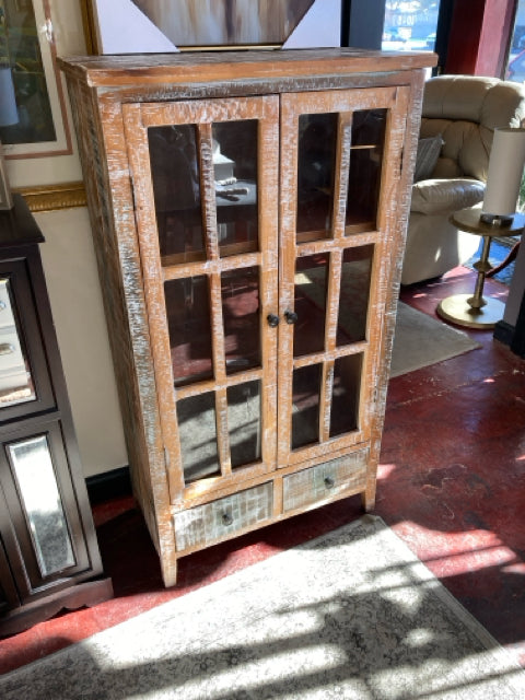 Brown/White Wood/Glass Distressed 2 Door Cabinet