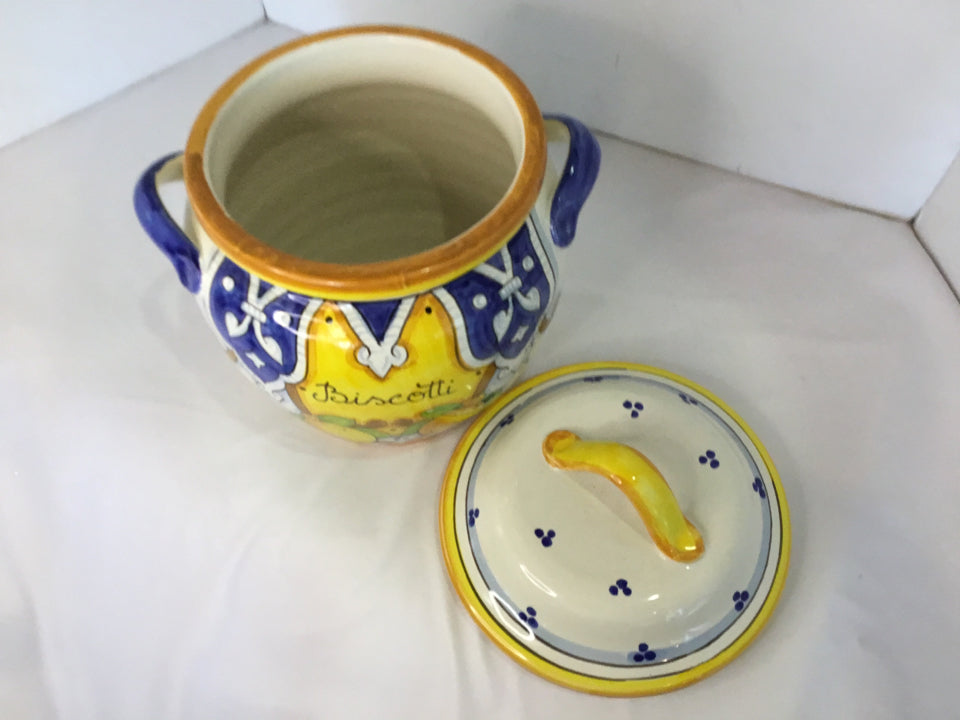 Lidded Blue/Yellow Ceramic Biscotti Jar