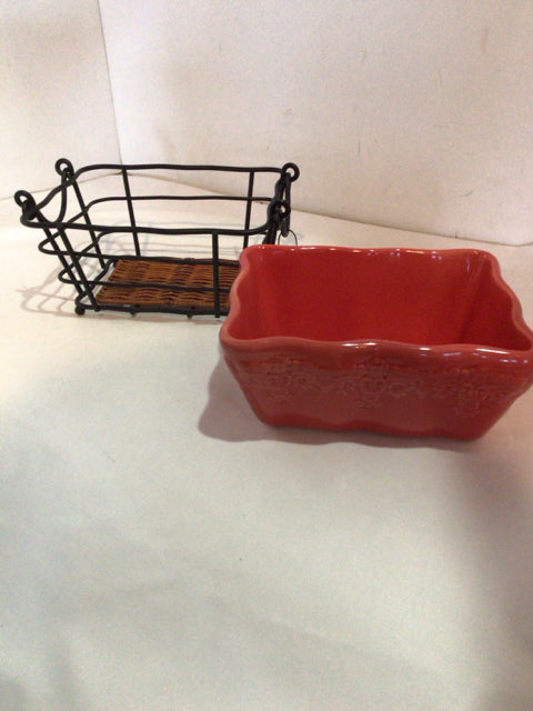 Loaf Pan Red/Black Ceramic/Metal In Basket Dish
