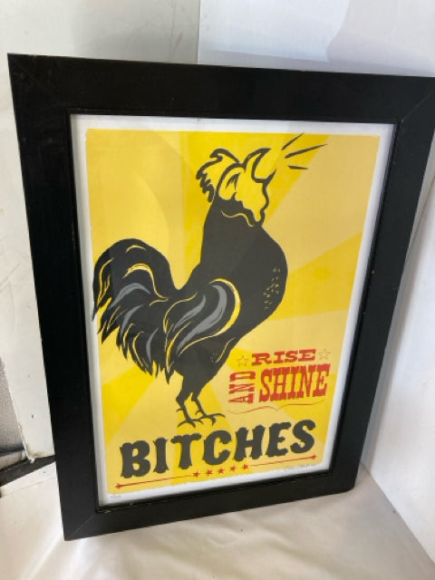 Vintage Yellow/Black Rooster Words Framed Art