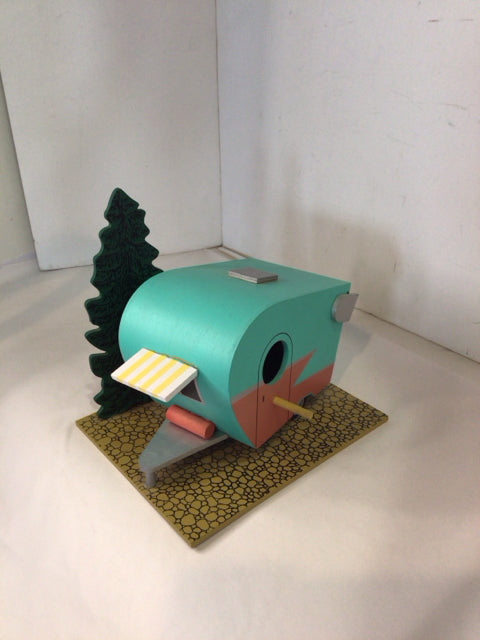 Whimsical Aqua/Tan Wood Camper Bird House